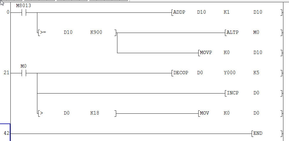 比如我要編這么個程序,要求是這樣的:有19個電磁閥要輪流接通,每隔半小時接通一個,第二個接通第一個要關閉,第三個接通前二個要關閉。到第19個關閉后第一個接通。始終只有一個是接通的。我用循環(huán)右移指令要怎么編呢?