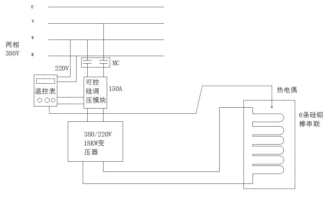 硅鉬棒加熱沒有做個,直接把硅鉬棒加熱做成380V加熱省去一個18KW變壓器,或者把可控硅調節器選擇單相輸入。