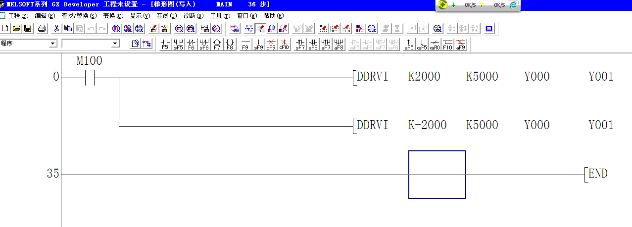 三菱PLC的話,用相對位置指令DRVI,要正向2000個脈沖再反向2000介脈沖。 如 —[DDRVI K2000 K5000 Y0 Y1]— —[DDRVI K-2000 K5000 Y0 Y1]— 程序中還要用到特殊繼電器M8029,M8029正常完成標志位。當所需的脈沖發完后對DRVI進行監控。 也就是要正向走脈沖發的是正數,要反向走脈沖發的是負數!!! 如果要發完正脈沖后停一下,可以用一個定時器!!! |