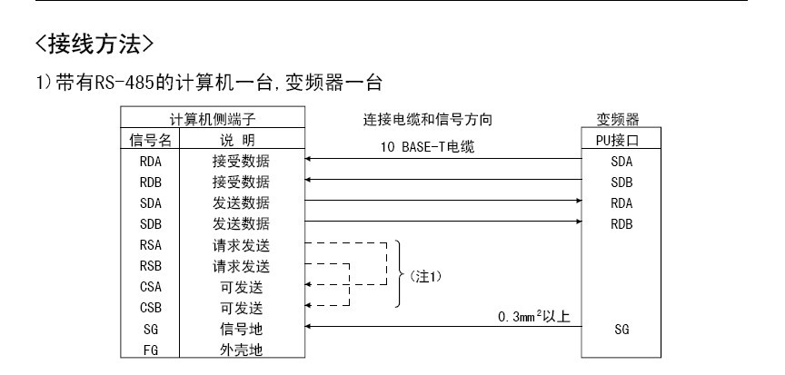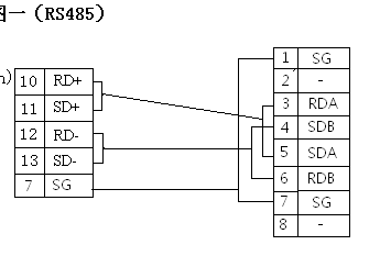 想修改三菱E500變頻器的參數(shù),由于沒有操作面板,沒辦法修改參數(shù)了,就想到用變頻器參數(shù)調(diào)試軟件來修改,但在變頻器與PC接線中遇到一點問題,如圖所示,為變頻器說明書上介紹的關(guān)于變頻器PU口與RS485頭接線圖,由于PC沒有RS485口,特買了個RS232轉(zhuǎn)RS485的轉(zhuǎn)換頭,但這個轉(zhuǎn)換頭RS485端只有三個接線柱,為一個正端,一個負端,還有個接地端,可能是RS485兩線制的,可說明書介紹的是RS485四線制的接法,這可怎么辦?這個轉(zhuǎn)換頭還能用嗎?可以用的話,該怎么接?大俠來說說你的想法。謝謝