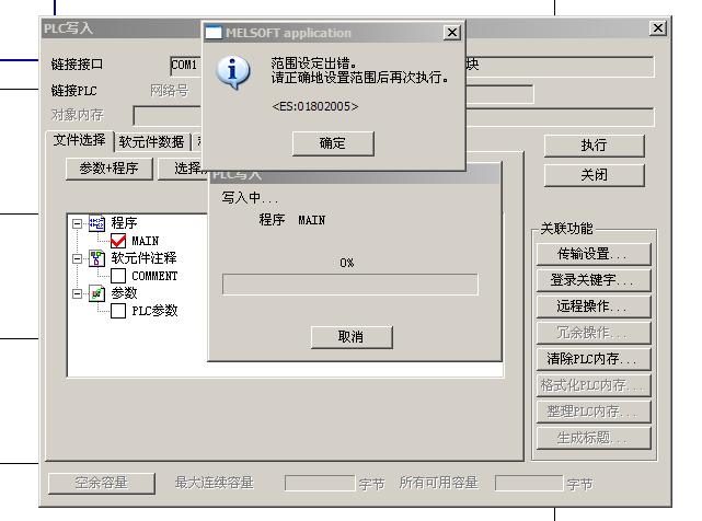 就算是下載空程序也是一樣,型號是fx-1s30MR。已經將plc清理過內存也是一樣,數據線在下載另一臺fx-1N30MR時正常,請問是什么原因?設置試過了,就是步數試2000步,我寫了20步無法傳送。