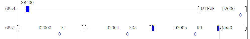 請(qǐng)問(wèn) 下這段程序怎么在PLC當(dāng)前時(shí)間7點(diǎn)鐘不能顯示出來(lái)D2003=7呢?是我程序?qū)戝e(cuò)了嗎,請(qǐng)高手指點(diǎn)下,謝謝!