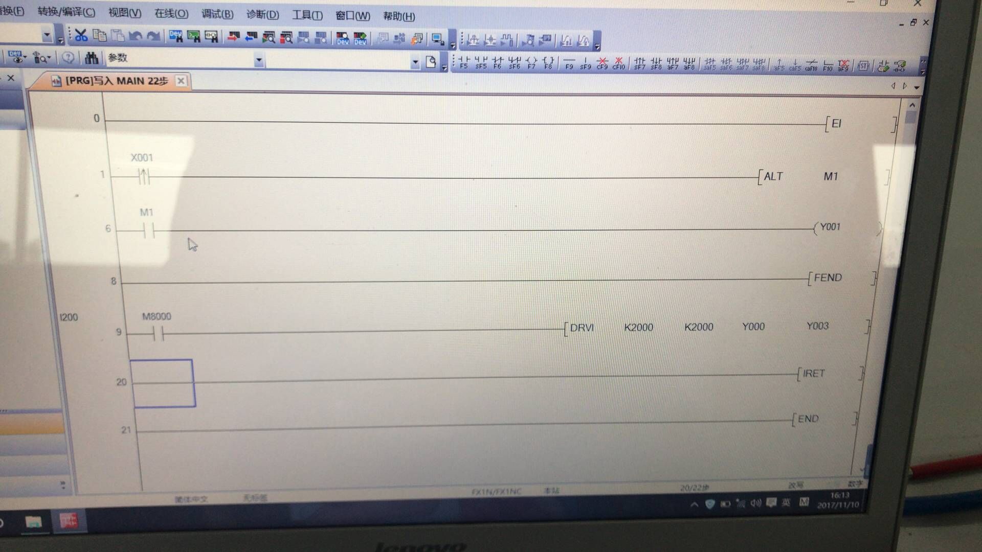 Y1是個三相異步電動機(jī)垂直的放,上面一個偏心輪帶著刀上下動。Y0是個步進(jìn)電機(jī),水平的移動要控制這個電機(jī)在刀下來的時候不動,刀上去時才動一毫米。X1是啟動,X2是一個感應(yīng)器在刀離開水平面是就亮一下。這個三相異步電機(jī)速度是每分鐘3000轉(zhuǎn)。小弟在公司里要改個小東西,希望幫忙。