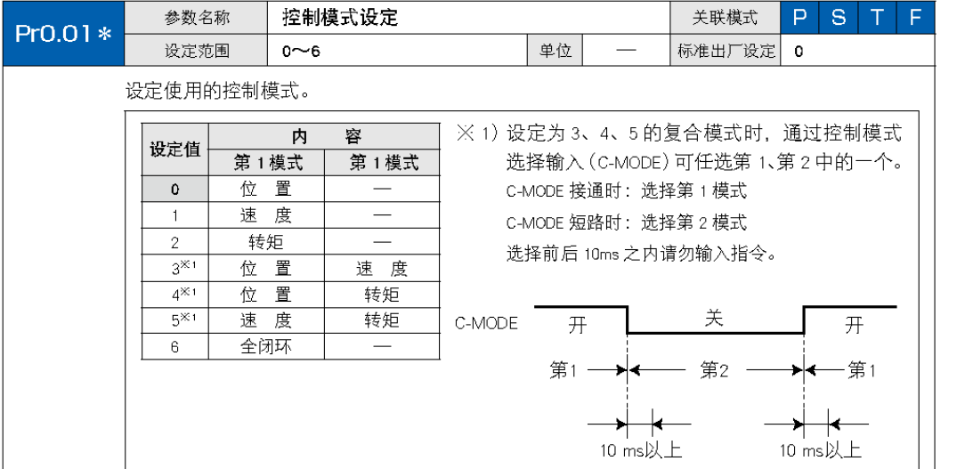 引用引用第3樓ma924888027于2018-03-07 09:28發表的 :Pr0.01是控制模式設定,0-位置模式,1-速度模式,2-扭矩模式,3-位置、速度模式,4-位置、扭矩模式,5-速度、扭矩模式,6-全閉環模式。[attachment=219927]