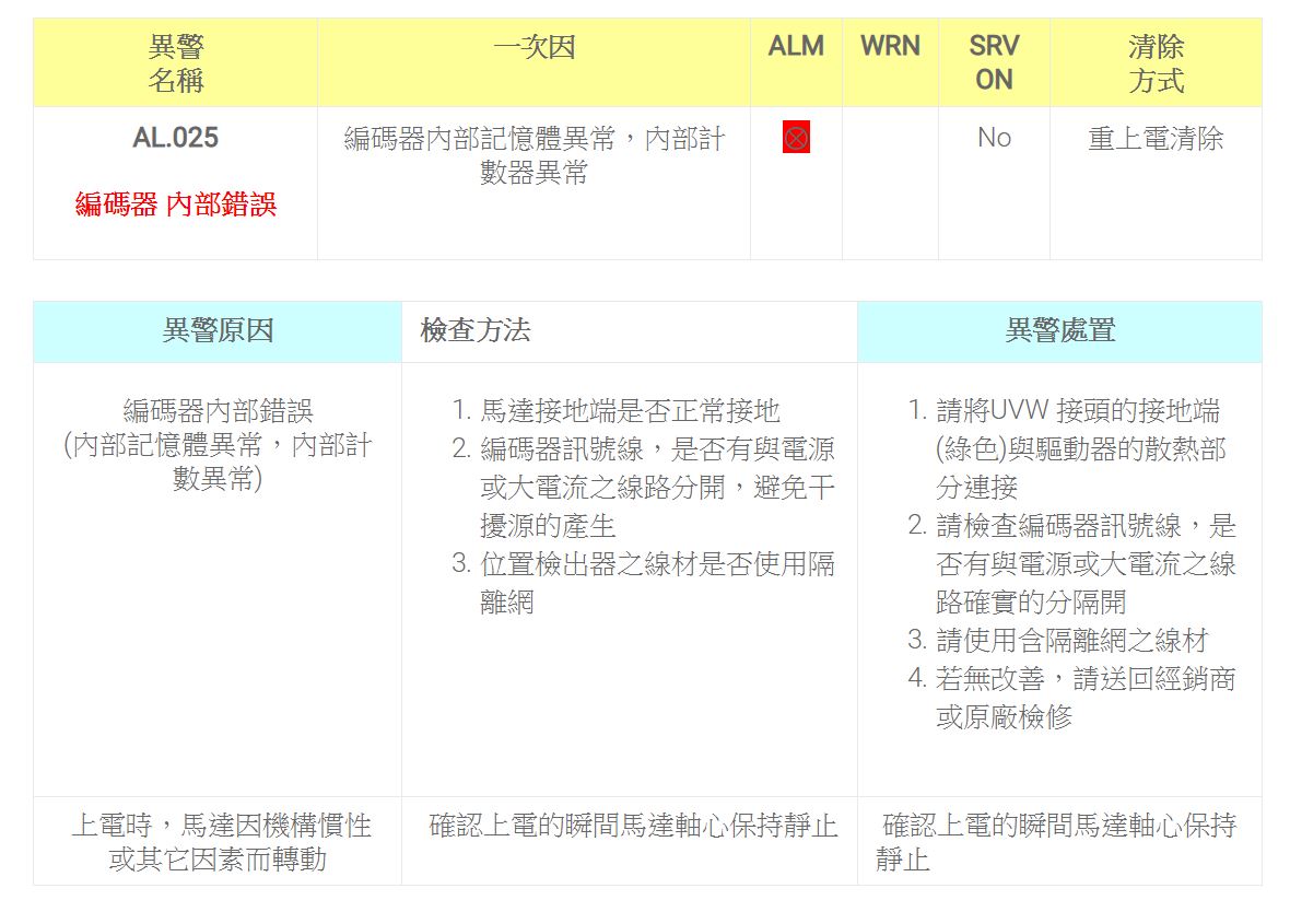 電機是帶絲桿的,但是絲桿沒拆,也沒脫開試! 比較難拆! 搞機械的沒在現場! 但是如果是絲桿卡住,應該是報過載吧 會報 編碼器故障這個代碼嗎(AL.025)
