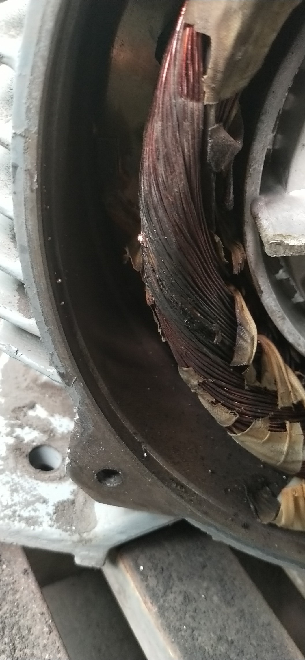 這種不是缺相,缺相是兩相線圈燒成黑色的,這中應(yīng)該是一相瞬間擊穿搭鐵,因?yàn)榕c短路點(diǎn)與進(jìn)線側(cè)很近,所以瞬間短路過(guò)熱燒壞漆包線!