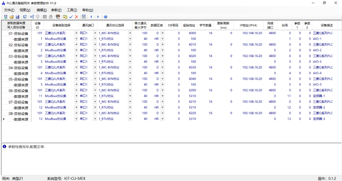 案例是通過一個(gè)IGT-SER智能網(wǎng)關(guān),實(shí)現(xiàn)遠(yuǎn)程IO模塊、智能儀表,變頻器與PLC通訊。 網(wǎng)關(guān)與變頻器之間采用ModbusRTU串口通訊,網(wǎng)關(guān)與變遠(yuǎn)程IO模塊也是之間采用ModbusRTU串口通訊,都接成RS485網(wǎng)絡(luò)后分別接入網(wǎng)關(guān)的串口1和串口2。由于通訊距離不一樣,遠(yuǎn)程IO的485網(wǎng)絡(luò)通訊波特率等設(shè)置與變頻器儀表485網(wǎng)絡(luò)的有區(qū)別。 網(wǎng)關(guān)與PLC之間是網(wǎng)絡(luò)通訊,采用PLC廠家的專用協(xié)議,無需PLC編程配合,系統(tǒng)結(jié)構(gòu)如下圖: ![]() 根據(jù)以上結(jié)構(gòu)圖,通過網(wǎng)關(guān)參數(shù)配置軟件(下載地址),配置相關(guān)PLC的寄存器地址與Modbus寄存器的地址對(duì)應(yīng),分配PLC的IP地址端口號(hào)碼,以及IO模塊,變頻器的站號(hào)等。配置完成后下載到網(wǎng)關(guān)模塊(參數(shù)->參數(shù)寫入到網(wǎng)關(guān)),然后重啟(工具->重啟網(wǎng)關(guān))即可。 案例是采用的三菱Q系列的PLC,下位設(shè)備分別是遠(yuǎn)程模塊、變頻器,完整的數(shù)據(jù)配置表入下圖: ![]() 可以看到配置里面更新周期的毫秒數(shù)為0,這樣是按數(shù)值變化更新,可以大大提高整個(gè)系統(tǒng)的實(shí)時(shí)性。完成上述配置后將參數(shù)下載到網(wǎng)關(guān)后重啟,即進(jìn)入正常工作狀態(tài),可以打開PLC軟件監(jiān)控對(duì)應(yīng)的數(shù)據(jù)寄存器的數(shù)值。 網(wǎng)關(guān)模塊支持三菱、歐姆龍、西門子、AB等大多數(shù)品牌的PLC,相關(guān)的詳細(xì)介紹和軟件: ![]() |