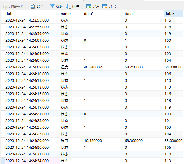 參數設置完成后通過‘參數’->‘參數寫入到網關’將參數寫入到網關模塊,‘工具’->‘重啟網關’,然后‘參數’->‘從網關讀取參數’,在狀態欄會顯示網關的狀態;如果狀態正常,通過數據庫工具軟件Navicat連接數據庫,查看數據表中的數據,如下圖: