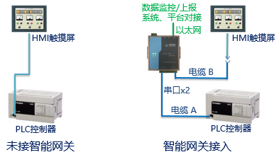 在PLC的通訊端口被觸摸屏占用時,不用增加另外的通訊模塊,按照以下方式直接加入IGT-SER系列智能網關模塊,實現PLC與數據庫雙向通訊,具體原理如下: