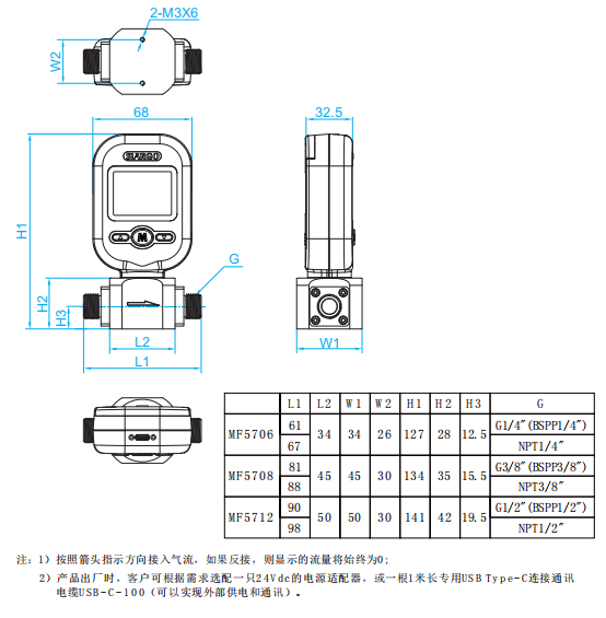 美國Siargo便攜式氣體質量流量計MF5700系列產品結構與機械尺寸: