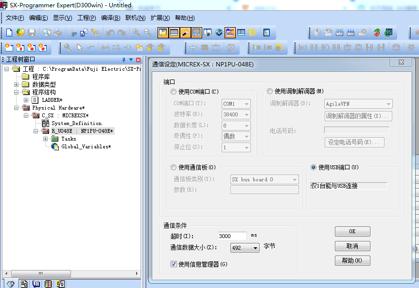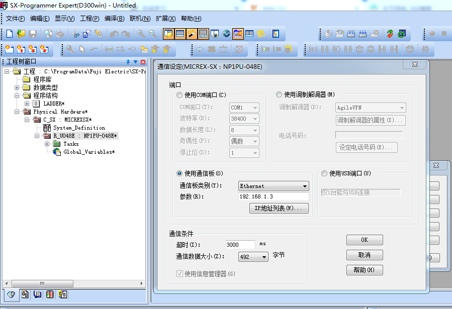 請教各位大神,初次使用富士PLC,D300WIN聯機使用了MINI USB電纜和交叉網線都連不上,麻煩幫忙看下通訊參數設置有沒有問題?十分感謝!
