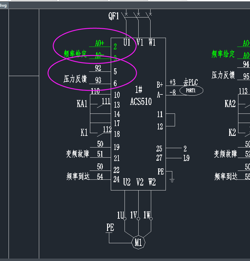 1、手動(dòng)是510內(nèi)置PID控制  2、 自動(dòng)時(shí)PLC的PID控制       恒壓供水[