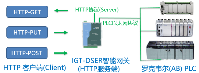 智能網關IGT-DSER集成了多種PLC的原廠協議,方便實現各種PLC的原廠協議轉換為HTTP協議的服務端,通過網關的參數配置軟件綁定JSON文件的字段與PLC寄存器地址,即可接收來自客戶端的GET、PUT和POST命令,解析和打包JSON文件。