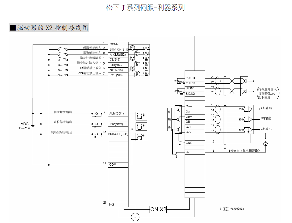 松下利器NEWE驅動器X2端口PLC輸出為NPN接線管腳20/22接DC24V+,管腳21接PLC脈沖端口,管腳23接PLC方向端口。PLC輸出為PNP接線管腳21/23接DC0V,管腳20接PLC脈沖端口,管腳22接PLC方向端口,20/22或21/23連接PLC時各串一個2K電阻,請問這樣接線對嗎
