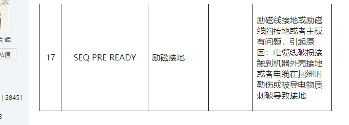 17 SEQ PRE READY 勵磁接地 勵磁線接地或勵磁線圈接地或者主板有問題,引起原因:電纜線破損接觸到機器外殼接地或者電纜在捆綁時勒傷或被導電物質刺破導致接地 |