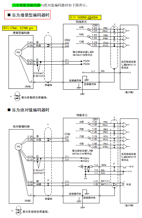 這是安川伺服給出的編碼器接線,(CN2)這個(gè)插接頭是增量型與絕對(duì)型共用的,僅絕對(duì)值類型多兩跟電池線.有哪位大俠能解釋下增量編碼器信號(hào)與伺服控制器之間的傳輸機(jī)制嗎?