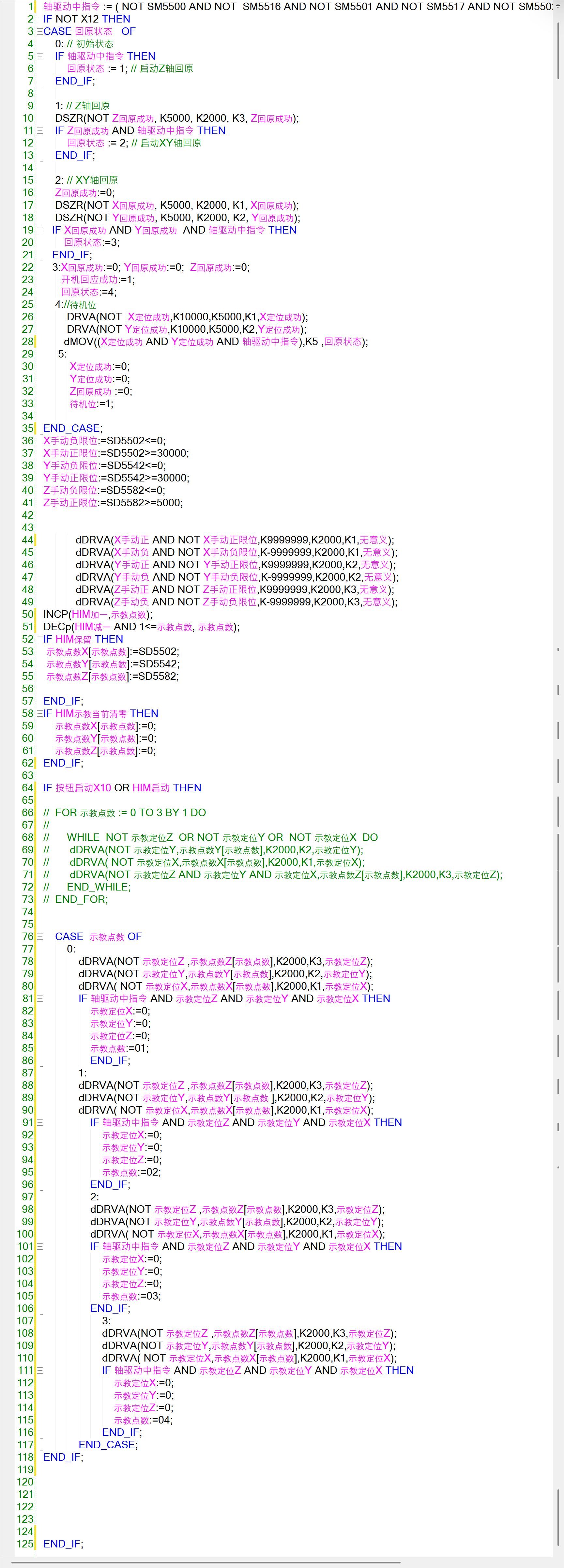 循環就是重復地執行相同的指令,處理類似的數據(基址+變址),把你控制一個軸的思路重新整理一下,再規劃地址,確認好每個軸的不同數據地址之間的偏移,再用For循環去處理這些偏移即可。從簡單的練起,100個按鈕控制100個不同的燈=》100個按鈕分別按3秒控制100個不同的燈=》100個按鈕,按不同的時間(可配置,地址為D0,D1,D2,D3...或D0,D10,D20,D30...或D0,D100,D200,D300...時,不同地址偏移,循環要怎么改),控制100個不同的燈,理解了這個,再去寫個這個軸控的,當然,軸控有些還看時序 |