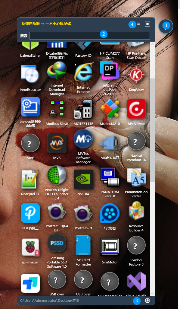 工業軟件多、辦公軟件、開發軟件等等很多,桌面上啥都有,亂七八糟,創建一個工業軟件文件吧 ,每次都得打開文件夾找,我想著是不是可以自己開發一個鼠標放上去,直接顯示軟件快捷鍵和exe的窗口,離開就消失。