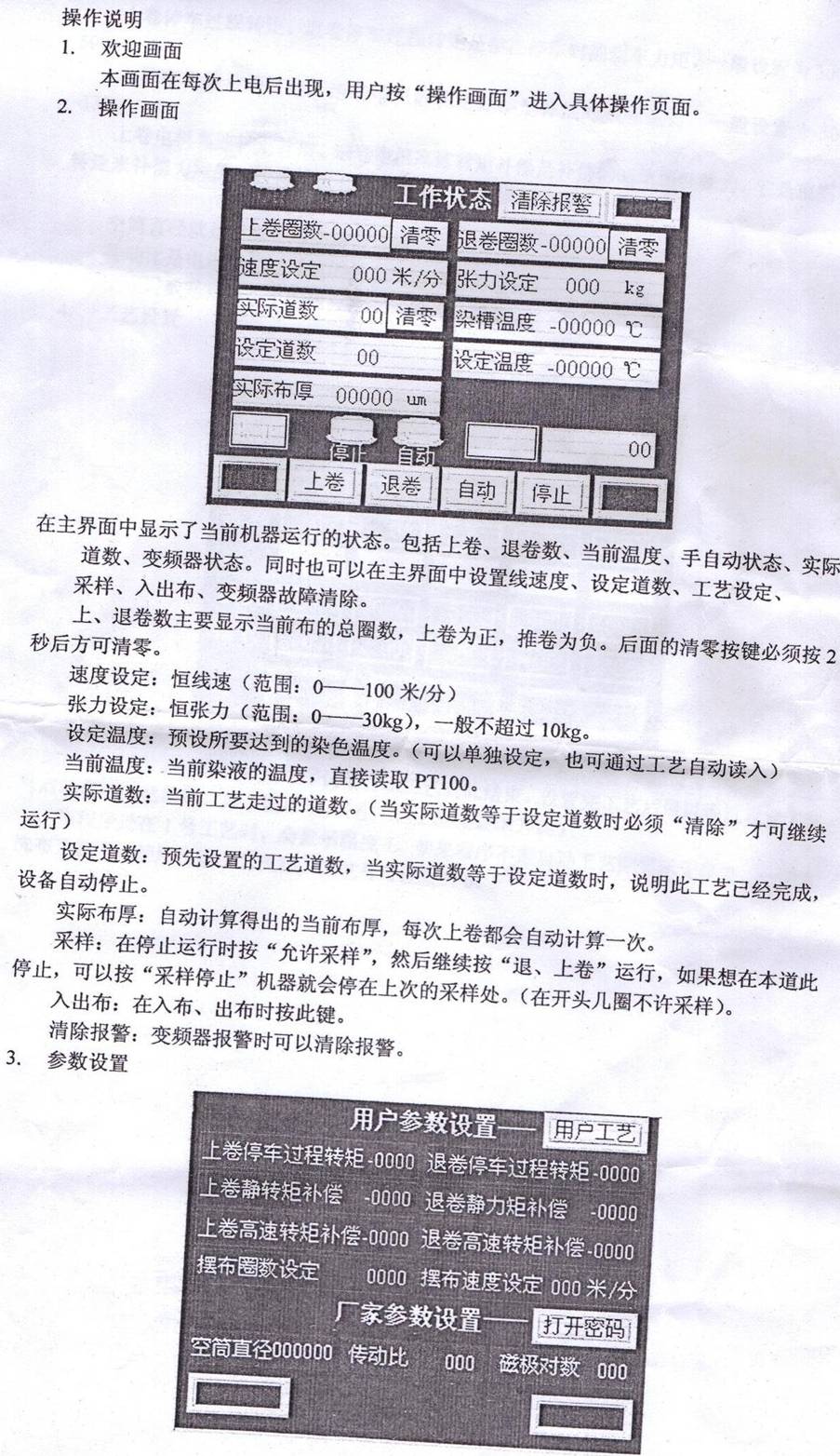 上布時刻,PLC記錄下該布卷在輥筒上的總?cè)?shù),進布完成后,在觸摸屏上點擊初始按鈕,系統(tǒng)自動進行初始卷徑計算,之后系統(tǒng)可時時計算出當前兩個輥筒的直徑(無需輸入布厚或人工測量滿卷時的直徑),并根據(jù)系統(tǒng)設(shè)定的線速度和張力,計算出相應的轉(zhuǎn)距(放卷電機)和匹配頻率(收卷電機);再通過串行RS-485通訊,傳送給變頻器,作為控制收、放卷電機的基本參數(shù)。