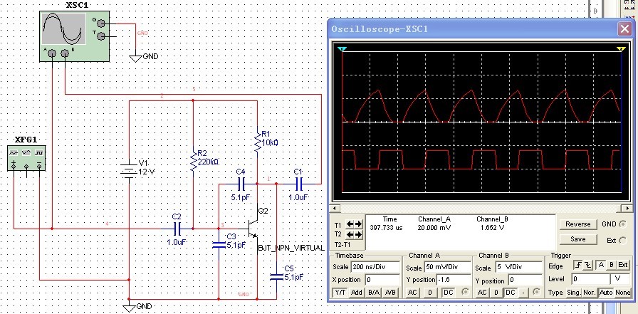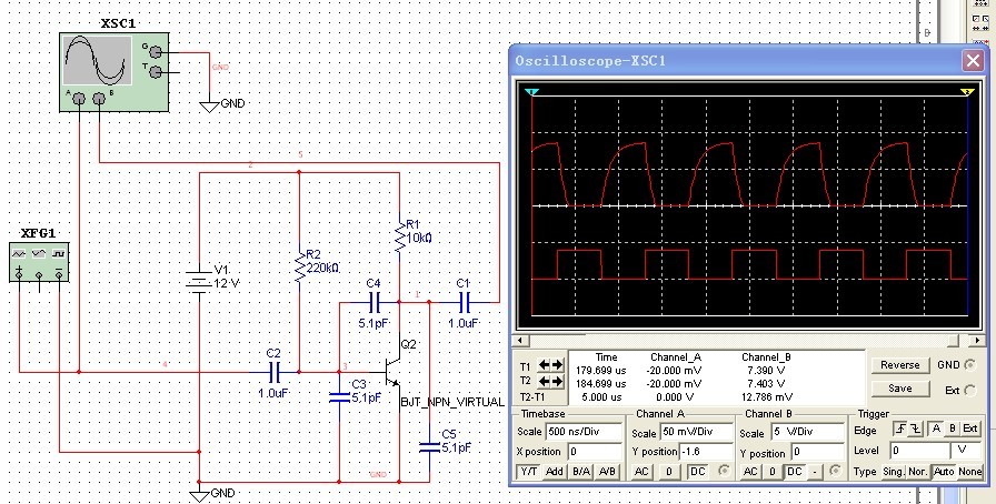 輸入為1MHz的方波,增加結電容c3,c4,c5輸出波形變化,圖中為理想三極管,增加等效結電容。