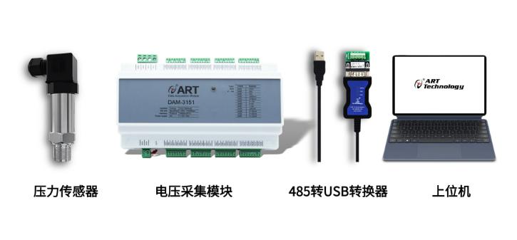 在這一方案中,我們建議采用壓力傳感器輸出的電信號,通過采集模塊結合采集到的電壓,并通過485轉USB轉換器將數據傳輸至上位機進行處理和分析,從而通過閾值來判斷現場壓力變化情況。