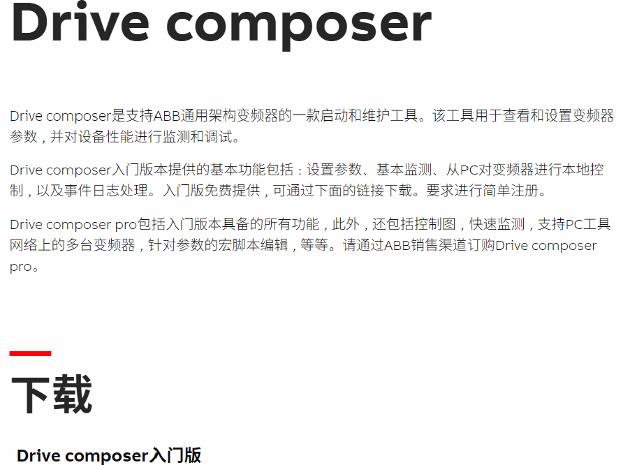 Drive Composer 入門版:這是支持 ABB 通用架構變頻器的啟動和維護工具,可用于查看和設置變頻器參數,以及對設備性能進行監(jiān)測和調試。其基本功能包括設置參數、基本監(jiān)測、從 PC 對變頻器進行本地控制以及事件日志處理等。用戶可以通過 ABB 官網進行簡單注冊后下載。