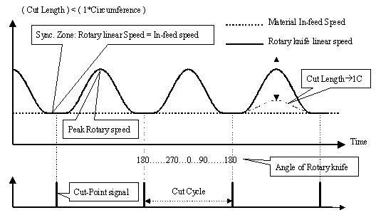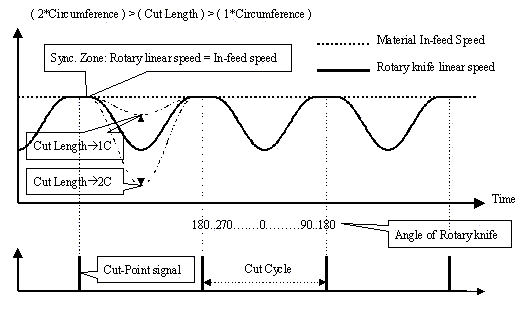 2. 經(jīng)過(guò)PDS-RC控制系統(tǒng)精確的計(jì)算、控制,在「裁刀速度」上升到一定值之後,立刻開(kāi)始減速;務(wù)求在「裁刀速度」下降到與「進(jìn)料速度」同步的同時(shí),「裁切刀輪」也恰好進(jìn)入「同步區(qū)域」;並維持同步直到第二個(gè)「裁切點(diǎn)」出現(xiàn),乃完成一次「裁切循環(huán)」。