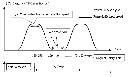 3. 切長(zhǎng)圓周比」越趨近1,則速度下降越少;當(dāng)「切長(zhǎng)圓周比」等於1時(shí),「裁刀速度」在整個(gè)「裁切循環(huán)」中都維持與「進(jìn)料速度」完全同步。