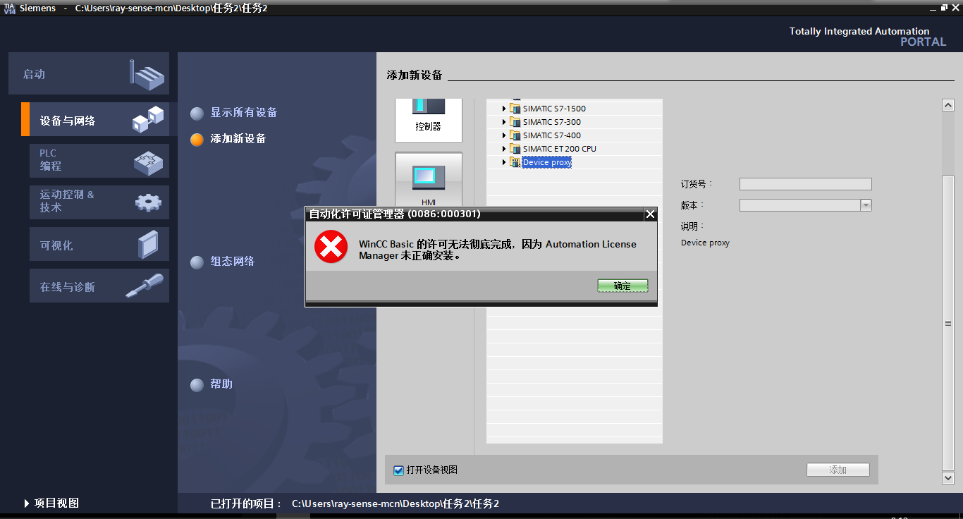 STEP7 PORTAL V14安裝完并授權(quán)完,在組態(tài)設(shè)備的時候提示automation license manager未正確安裝是怎么回事!跪求各位大神,這該怎么解決,在線等,急!