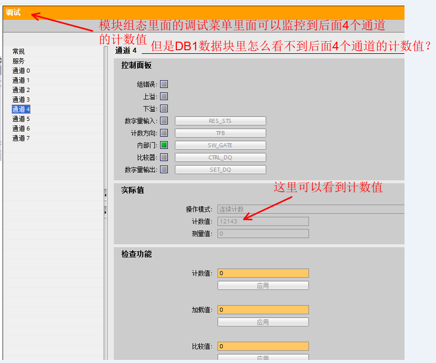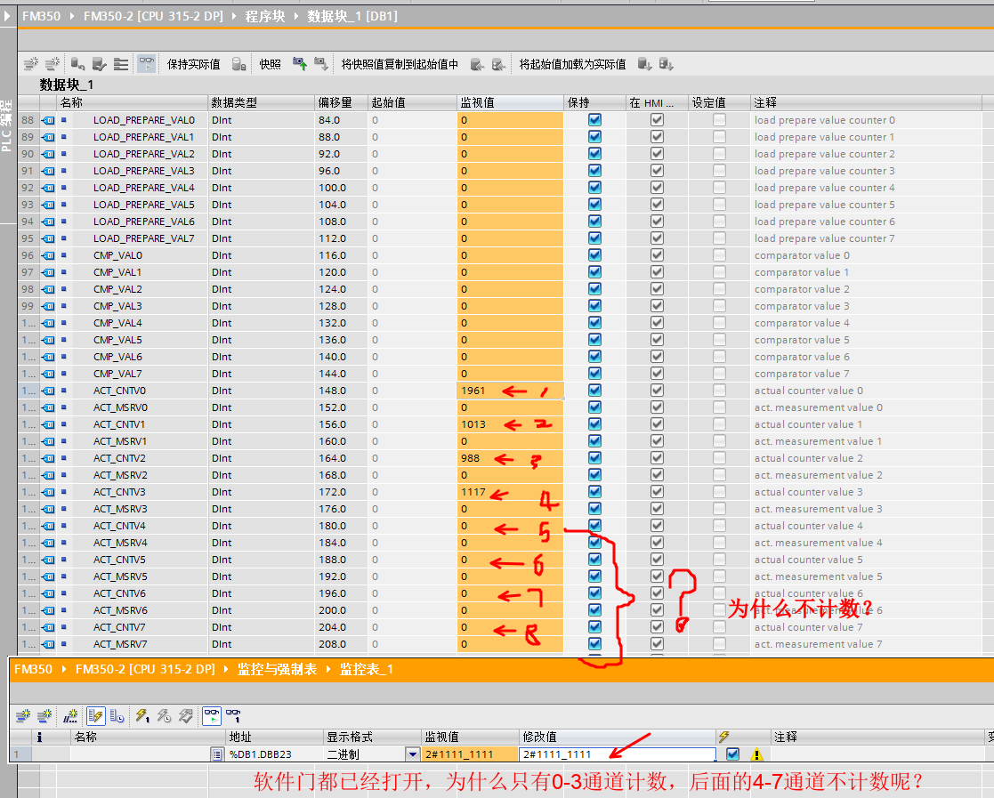 1.接的是歐姆龍24v增量編碼器,把A相分別接到1--4通道進(jìn)行測試,旋轉(zhuǎn)編碼器,DB1里面的1--4通道的當(dāng)前計數(shù)值有變化,可以采集到計數(shù)值,但是接到5---8通道中,旋轉(zhuǎn)編碼器,DB1里面就不顯示計數(shù)值,但是右擊模塊進(jìn)入調(diào)試?yán)锩妫芸吹?---8通道在計數(shù),但是DB1的數(shù)據(jù)塊里,怎么沒有計數(shù)值?