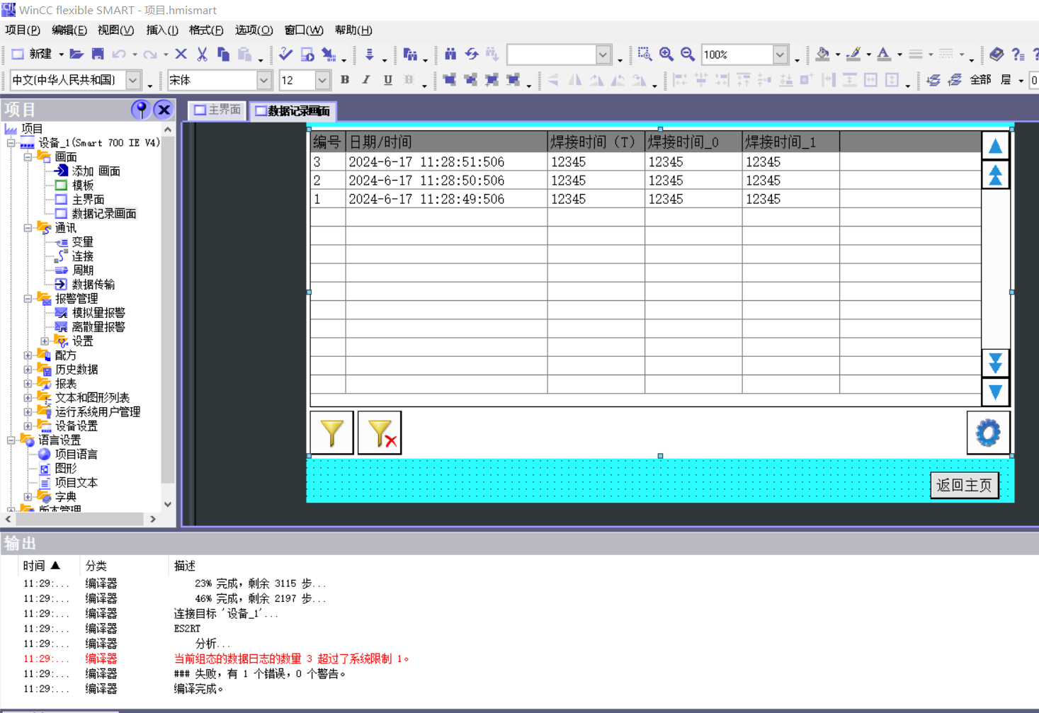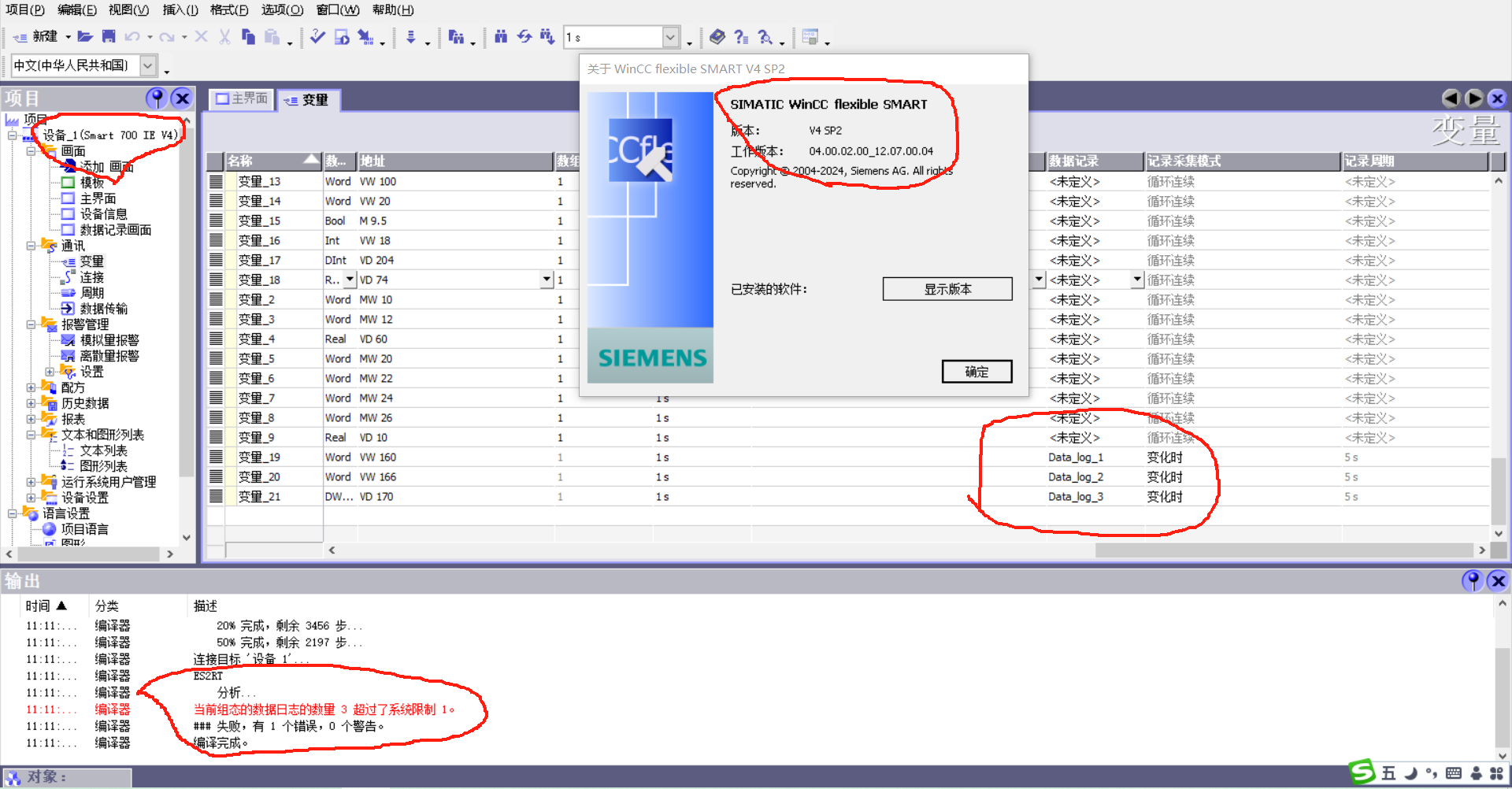smart 700 IE V4觸摸屏數據日志數量1個時編譯沒問題,數據日志數量2個或者3個就超過系統限制1,就編譯出錯,編程軟件是SIMATIC WinCC flexible smart V4 SP2,數量多的2個刪到1個就能正常使用