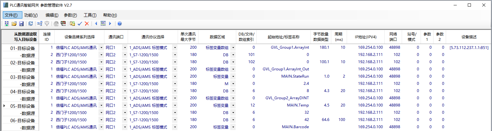 PLC內(nèi)不用編程,實(shí)現(xiàn)西門子1200的PLC跟倍福PLC標(biāo)簽方式通訊,采用IGT-DSER智能網(wǎng)關(guān),它支持多個品牌的PLC之間多對多通訊,最多8000個字節(jié)的數(shù)據(jù)交互量,相關(guān)參數(shù)在一個頁面內(nèi)配置,方便直觀。通過智能網(wǎng)關(guān)的參數(shù)軟件(在附件中)選擇PLC之間通訊的功能,下面是配置截圖: ![]() 任務(wù)01:讀取西門子DB101.DBW0開始的90個的INT類型的數(shù)據(jù),寫入到倍福PLC的 GVL_Group1.ArrayInt 數(shù)組(從0開始),共180字節(jié); 任務(wù)02:讀取倍福PLC的 GVL_Group1.ArrayInt_Out 數(shù)組(從0開始)的50個INT類型的數(shù)據(jù),寫入到西門子DB102.DBW0開始的100字節(jié); 任務(wù)03:讀取西門子M2.4的1個BOOL類型的數(shù)據(jù),寫入到倍福PLC的 MAIN.StateRun 標(biāo)簽; 任務(wù)04:讀取倍福PLC的 GVL_Group2_ArrayDINT[12] 的1個DINT類型的數(shù)據(jù),寫入到西門子DB6.DBD8,共4字節(jié); 任務(wù)05:讀取西門子DB6.DBD32的1個的REAL類型的數(shù)據(jù),寫入到倍福PLC的 MAIN.Temp 程序標(biāo)簽,共4字節(jié); 任務(wù)06:讀取倍福PLC的 MAIN.Barcode 標(biāo)簽的1個STRING類型的數(shù)據(jù),寫入到西門子DB6.DBB42的STRING[60]類型的地址,共60字節(jié)。 配置文件和軟件: ![]() |