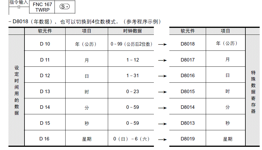 用時鐘寫入數據TWR指令,觸摸屏對應地址,就可以修改PLC內部時鐘