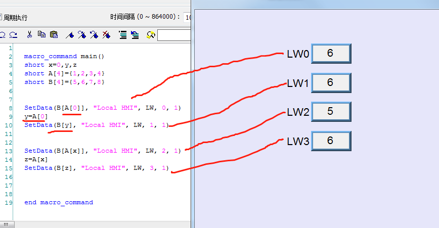 ![]() 威綸通漏洞所在?? macro_command main() short x=0,y,z short A[4]={1,2,3,4} short B[4]={5,6,7,8} SetData(B[A[0]], "Local HMI", LW, 0, 1) y=A[0] SetData(B[y], "Local HMI", LW, 1, 1) SetData(B[A[x]], "Local HMI", LW, 2, 1) z=A[x] SetData(B[z], "Local HMI", LW, 3, 1) end macro_command |