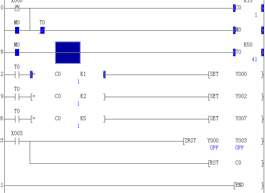 你這樣肯定不行的,M0在50S內(nèi)一直自鎖,C0在這個(gè)時(shí)間內(nèi)只能計(jì)數(shù)一次,你只需將第一行的X0移到那個(gè)豎線之后C0之前就可以了