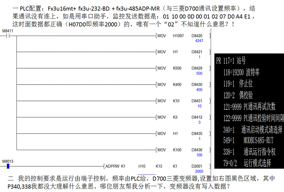 1 FX3U-485APT-MB與 D700變頻器通訊不上:我設置的頻率是2000于是我用串口助手讀取了發的數據: 01 10 00 0D 00 01 02 07 D0 A4 E1 我的理解依次是 01變頻器站號 , 10是寫入數據命令 , 00 0D 三菱變頻器的頻率設定地址,00 01 寫入寄存器的個數為1,07 D0則是我設定的頻率2000,