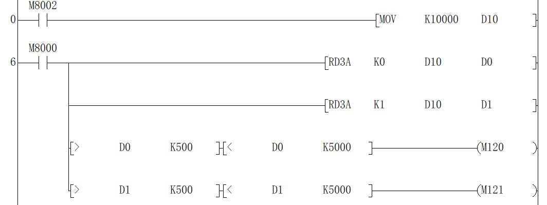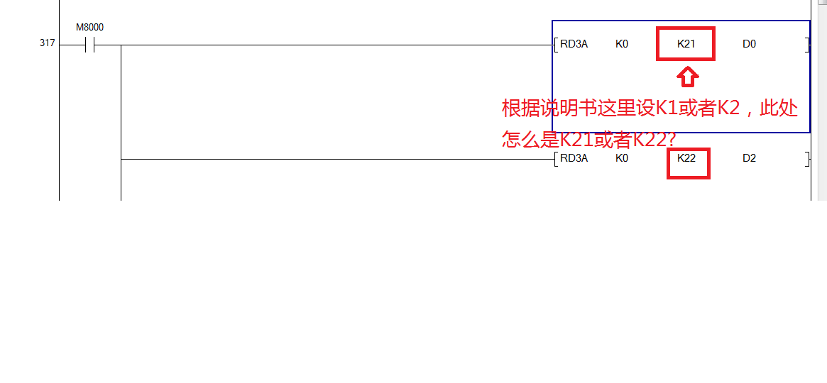 我司有個設備的程序,里面有一段程序是RD3A K0 K21 D0,我查了手冊應該是RD3A K0 K1 D0或者RD3A K0 K2 D0,其中的K1或者K2模擬量輸入通道號。