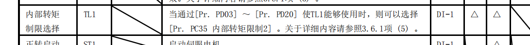 伺服使用位置模式,在定位時需要將伺服扭矩控制在一個范圍就是設一個限制,不知道使用內部扭矩限制能否生效,啟用TL1需要如何設置PD參數?引腳是如何用后面數字定義的?