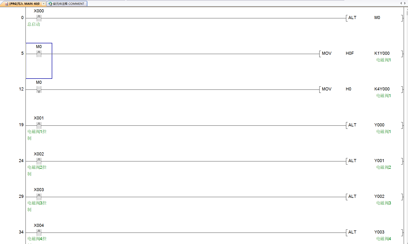 控制要求是:X0是總啟動也是總停止,按下X0四個電磁閥全都啟動,再按下X0電磁閥全都停止,每個電磁閥配備一個按鈕,要求總啟動時隨便按下哪個按鈕都可以停止對應電磁閥,總啟動沒有開始時,按下電磁閥對應的按鈕都能啟動和停止對應電磁閥。四個電磁閥對應按鈕分別是X1.X2.X3.X4,每個按鈕即是啟動也是停止。