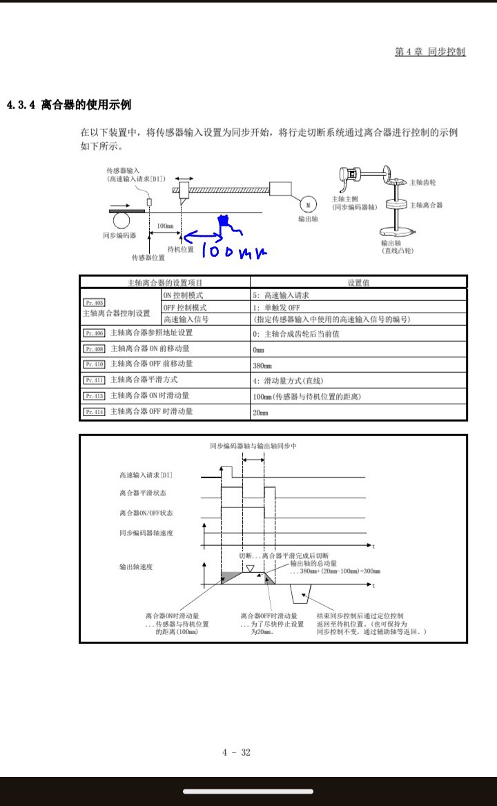 傳感器安裝在切刀待機位置之前100mm,通過設置pr413=100、切刀從0加速到和傳送帶速度相等時,切割點正好位于切刀下方。這種情況相當于是工件去追切刀