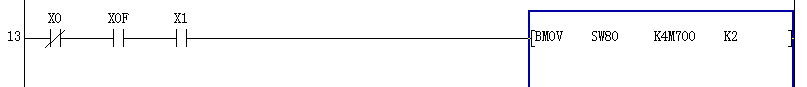 引用引用第2樓cuiyl于2008-11-07 09:05發表的 : 如果是BMOV SW80 K4M700 K2 意思就是傳送特殊連接繼電器sw80 開始 到 k4m700 =m700-m715 傳送位數k2=2個16位 結果就是從sw80開始到sw112的開和關也就是0.1數據映射到m700開始到m732上面。本人表達能力不行請多包涵!