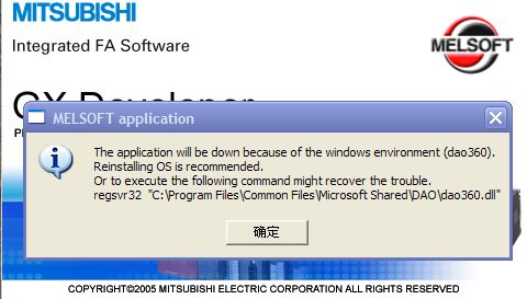 大家?guī)臀铱纯丛趺唇鉀Q這個(gè)問(wèn)題 ,我是用GHOST裝的系統(tǒng)有一次不知道怎么了就出現(xiàn)這個(gè)提示,我重裝了三菱軟件也是這個(gè)樣,在用GHOST重裝系統(tǒng)后還是有這個(gè)提示。照提示下載了DAO360.DLL文件也不行。現(xiàn)在我的電腦就沒(méi)法用三菱軟件了。我希望大家?guī)臀蚁朕k法怎么解決這個(gè)問(wèn)題。(我裝過(guò)兩種版本的XP都這樣所以搞糊涂了,除了三菱軟件有問(wèn)題其它軟件運(yùn)行完全正常)