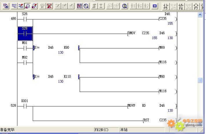 PLC是FX2N-128MR,20孔編碼盤套在馬達上,用接近開關進X0,馬達轉動同時驅動高速計數器C235,得到的數據存進D46,通過比較指令讓馬達停止,比較值有兩個,一個是90,另一個是110,要求馬達在數值90和110時都停止,馬達停止時按下X1用RST和MOVP指令對C235和D46都歸零。