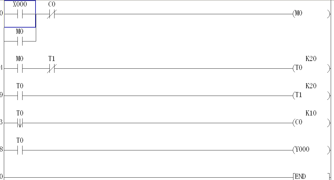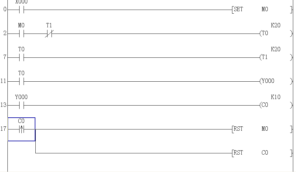 ![]() 按照你的描述,這個程序只能循環一次。最下邊的上升沿C0就是給M0和C0復位為下一個循環做準備。17就是最后一步了,END沒截圖。 |