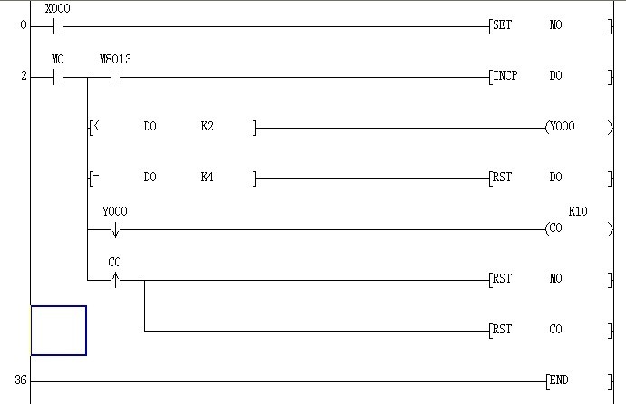 小弟初學PLC請大俠見諒。 我要的程序是按一個開關x0,輸出指示燈y0就亮2秒滅兩秒。直到亮滅十次自動關閉。搞了很久頭疼啊。忘大俠們寫出來給我參考下。謝謝 |