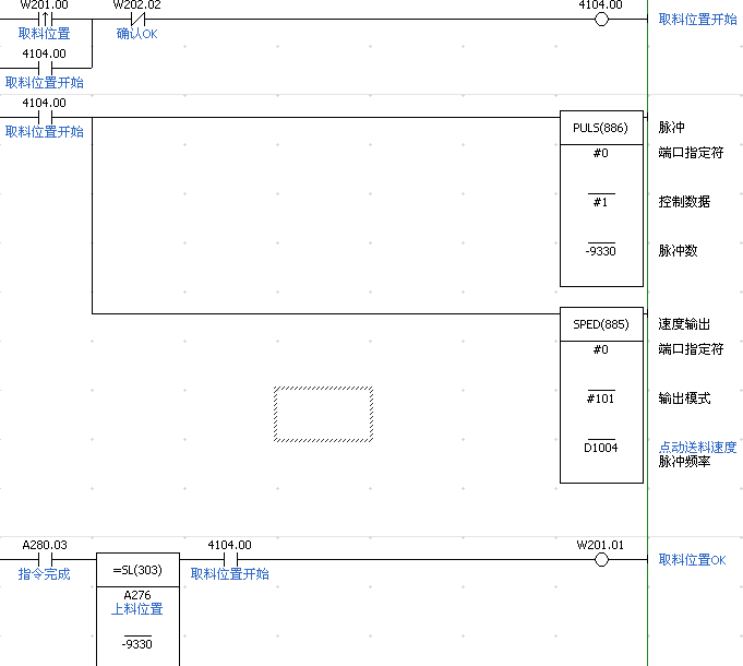 如圖此段程序,按下按鈕后,電機正常走動,結束后A280.03  =SL  和4104.00 都ON的,為什么w201.00顯示還不能ON?想不明白~~~