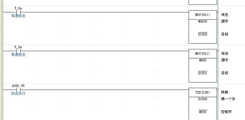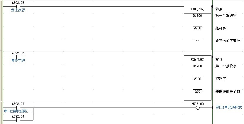 此處用的是歐姆龍無協議通信方式,TXD  s c n,s為發送數據的低通道號,成為控制字,15-12為0固定,11-8,1指串行口一輸出,2串行口二輸出,7-4,0為無RS,ER控制。3-0,0表示高字節在前。RXD 為接受指令情況類似