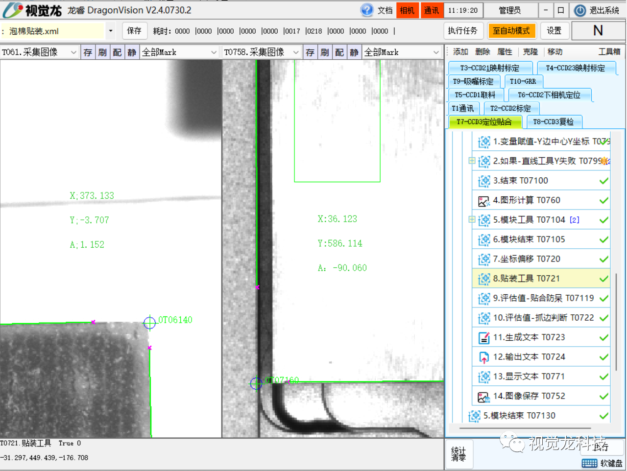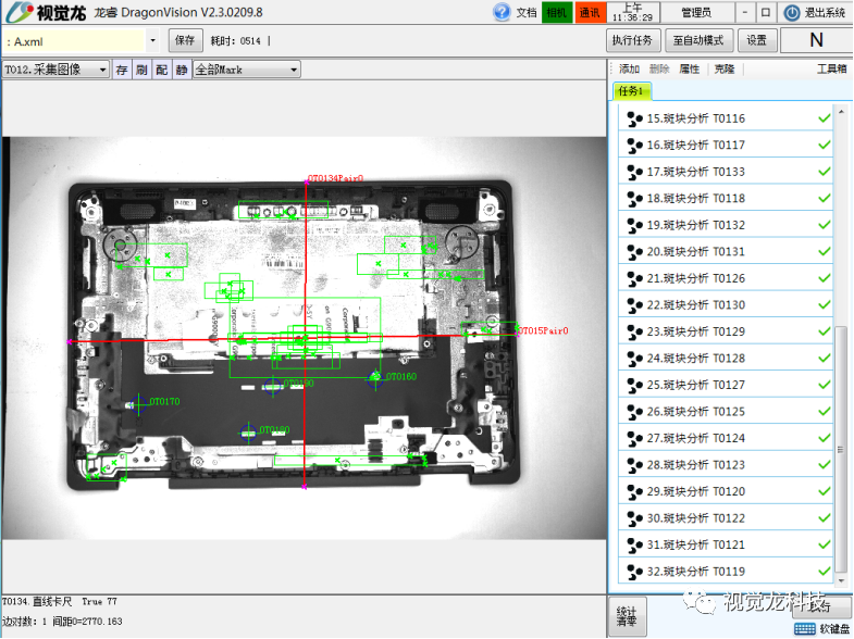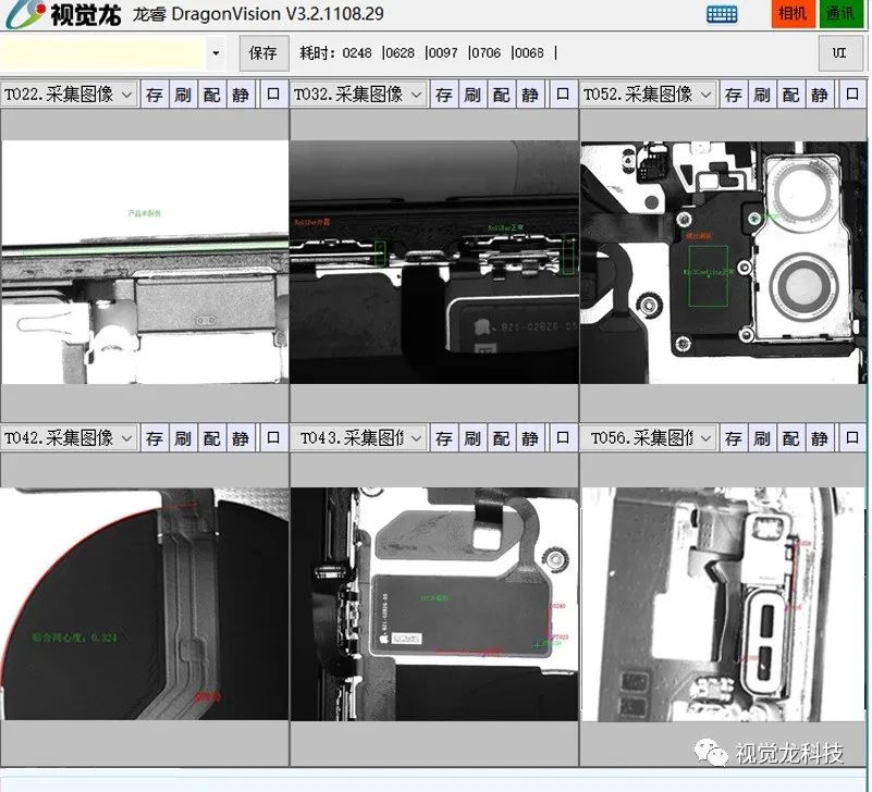 ![]() 視覺龍從視覺方案設計到定制整體解決方案,為各行業提供質量穩定、安可行的生產方式,幫助企業有效降低實施成本,提高生產效率和生產質量。視覺龍為智能制造行業客戶提供數字化、網絡化、智能化的機器視覺產品和服務。 01 服務器內觀和外觀柔性檢測 采用“龍睿旗艦型”的2D和3D視覺檢測技術,由2個機械手分別攜帶2D相機和3D傳感器,對服務器的內觀和外觀進行檢測。檢測標簽是否粘貼、對齊、破損,插接件類如內存卡、卡勾扣檢測,墊片的安裝檢測,螺絲的有無,擰花檢測,掃碼追溯查詢等。檢測漏檢率0%,檢測過檢率<1%,設備故障率<0.2%。 02 手機AOI檢測 采用“龍睿旗艦型”的視覺檢測技術,檢測手機內部零件的變形、外露、偏移、未組裝到位、螺絲未鎖、螺絲浮高等。 03 手機屏幕組裝間隙檢測 采用“龍睿標準型”的視覺檢測技術,對TP組裝到中框后進行間隙檢測,單邊間隙0.75mm±0.01mm。 04 智能手表輔料貼合 采用“龍睿型”的視覺對位貼合和飛拍技術,通過多工位多相機分別對產品的不同區域元件進行定位,同時對輔料進行位置識別,從而引導機械手/模組進行輔料貼合與復檢。 05 筆電輔料貼合 采用“龍睿型”對位貼合技術,首先機械手固定位置吸取輔料,移動到下相機對輔料進行精定位,視覺計算出輔料對位貼合的中心點。隨后機械手再帶著上相機移動到產品拍照位,對產品進行精定位,視覺計算出產品對位貼合的中心點,寫入貼裝工具即可。相機重復性精度0.02mm,貼合精度±0.15mm。 06 筆電分類激光打標 采用“龍睿型”的視覺定位技術,對筆電C件的型號進行定位識別,然后視覺將坐標信息與產品型號發送給PLC,引導機械手進行上料和激光打標。 07 筆電ACD鍵內觀檢測 采用“龍睿標準型”的視覺檢測技術,可以兼容多種型號的ACD面板進行一次性檢測。檢測物料有無貼片、塑膠件、螺柱、鈑金件、標簽貼紙、泡棉等。檢測精度<0.1mm。 08 藍牙耳機盒視覺定位組裝 采用“龍睿型”的視覺定位技術,工位1定位產品中間十字后,引導機械手進行多位置組裝。工位2對產品中間輪廓進行定位后,引導機械手多位置組裝。工位3對產品中間孔與橢圓進行定位后,引導機械手進行組裝。定位精度0.03mm。 09 手機螺絲與元件定位復檢 采用“龍睿標準型”的視覺定位和檢測技術,首先對手機中框螺絲與內部元件定位,實現螺絲和各類元件拆除。再對拆除后的區域進行復檢,判定有無拆除完整。螺絲定位精度±0.05mm,金屬蓋板定位精度±0.1mm。 10 無線充線圈定位打碼 采用“龍睿型”的視覺定位技術,對無線充的線圈視覺定位輪廓,輸出坐標給激光進行打碼,定位精度0.1mm。 |