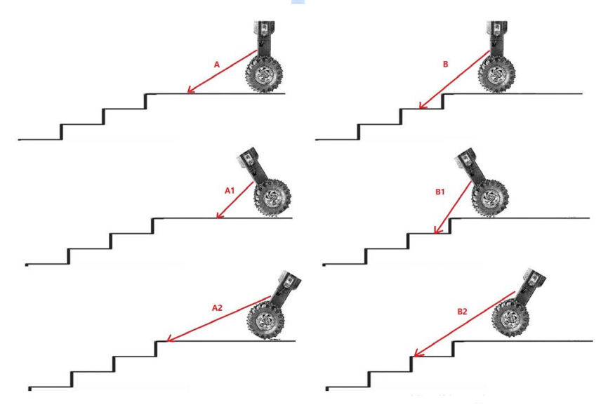 道路較平坦時,測距距離在 A1 到 A2 范圍內,并且距離變化較為連續;前方有階梯或者凹陷時,測距距離值會有明顯跳變,相同姿態下數值變大,(B>A,B1>A1,B2>A2)如下圖所示: