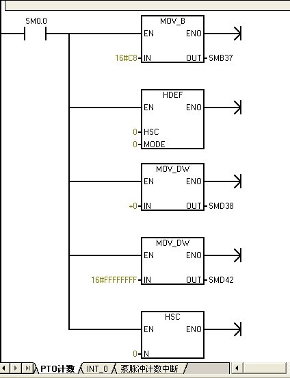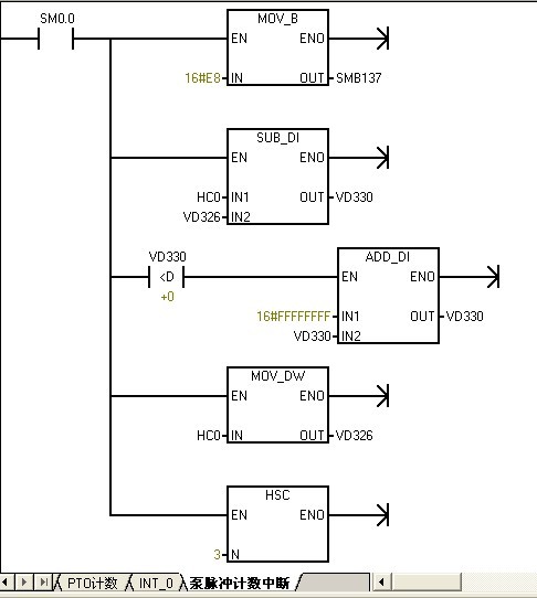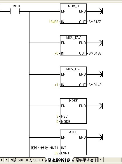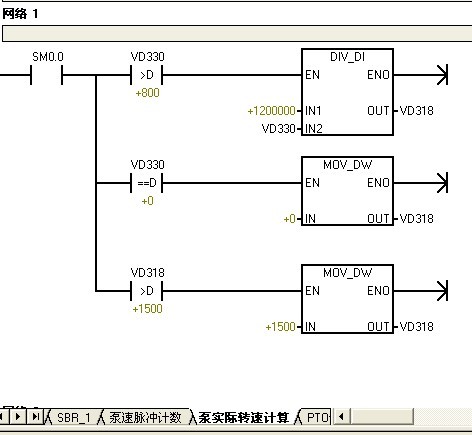 奶奶,終于搞定這程序了,大概意思就是先通過一個PTO定時輸出,高速計數器每收到一個脈沖信號后產生中斷,中斷后當前值減去上一次中斷的的計數值,1分鐘時間除于這次收到脈沖信號的時間值=每分鐘可以接到的脈沖數,也可以說是轉速